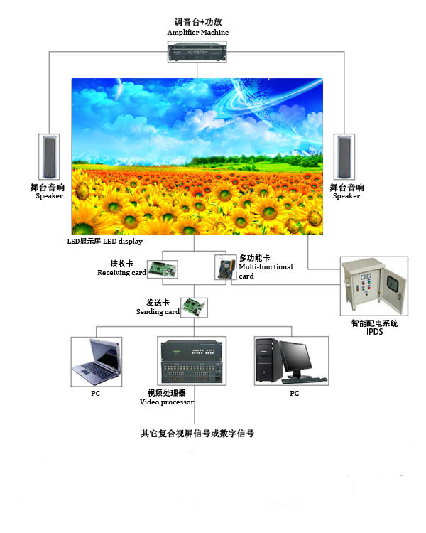 舞臺背景的要求隨著大屏幕LED顯示系統(tǒng)技術(shù)的提高,已越來越被編導(dǎo)們看好并運(yùn)用。大場景大畫面配合歌舞主體以達(dá)到渲染現(xiàn)場歡樂、熱烈的效果,使舞臺上下演員與觀眾融入一體,使觀眾身臨其境。、可將一個畫面切分為多個視頻畫面播出 、顯示屏可獨(dú)立、結(jié)合、任意組合使用播放相關(guān)大背景、大屏幕可根據(jù)演出需求分區(qū)顯示,并可實(shí)現(xiàn)圖文的迭加、背景畫面用視頻信號處理器播放或合成同一畫面顯示、可對人物特寫播放、可做文字滾動播放、或插播播放、可水平推移視頻畫面屏風(fēng),也可上下升降成為文字、個性視頻畫面、亮化、美化舞臺背景及舞臺地面、通過軟件設(shè)計及系統(tǒng)控制來滿足視覺上的效果。 佳惠科技以全新方案解決目前舞臺LED花樣顯示其繁瑣控制及完成更多的特效等難題,可以根據(jù)現(xiàn)場擺設(shè)的不規(guī)則LED點(diǎn)陣,可以根據(jù)現(xiàn)場顯示環(huán)境效果的需要,通過控制軟件配置,實(shí)現(xiàn)變換多樣的顯示效果。