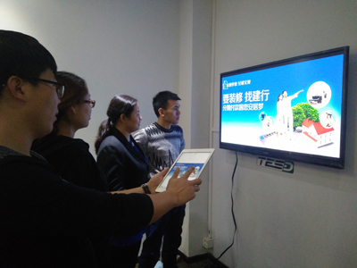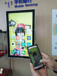我公司為內(nèi)蒙古建設(shè)銀行提供的手機(jī)同屏互動(dòng)系統(tǒng)可在充分利用建設(shè)銀行營(yíng)業(yè)網(wǎng)點(diǎn)現(xiàn)有的液晶電視和多媒體系統(tǒng)基礎(chǔ)上,實(shí)現(xiàn)更好的手機(jī)展示和互動(dòng)體驗(yàn)效果,提高金融銷(xiāo)售業(yè)績(jī)。當(dāng)不需要手機(jī)同屏互動(dòng)式時(shí),多媒體設(shè)備放廣告,當(dāng)顧客或營(yíng)業(yè)網(wǎng)點(diǎn)有同屏需求時(shí),屏幕切換成手機(jī)屏幕及相應(yīng)界面,供客戶(hù)參考。屏幕同步顯示手機(jī)屏幕和業(yè)務(wù)介紹信息,方便客戶(hù)自助體驗(yàn)和網(wǎng)點(diǎn)工作人員講解銷(xiāo)售。
