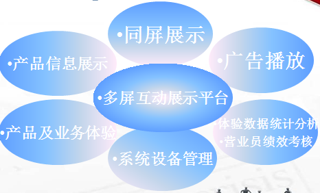多屏互動(dòng)展示系統(tǒng)呈現(xiàn)在客戶(hù)面前的是由多個(gè)屏幕組成的顯示墻或者多媒體顯示設(shè)備。不用時(shí),整個(gè)顯示墻可整體播放廣告。有同屏需要時(shí),對(duì)應(yīng)的顯示屏就會(huì)顯示授權(quán)的手機(jī)、蘋(píng)果IPAD等設(shè)備的信息內(nèi)容。同屏展示,則對(duì)應(yīng)的顯示屏?xí)?shí)時(shí)同步顯示手機(jī)屏幕內(nèi)容,如網(wǎng)銀、WEB內(nèi)容等。相對(duì)于單屏系統(tǒng),同屏展示系統(tǒng)更大氣、更醒目、更高檔、更吸引客戶(hù)!易形成客戶(hù)關(guān)注焦點(diǎn)!