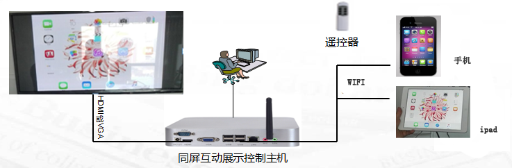 系統(tǒng)硬件:包括同屏互動(dòng)控制系統(tǒng)主機(jī)系統(tǒng)、多媒體顯示器、電視等。
