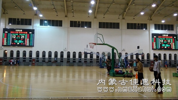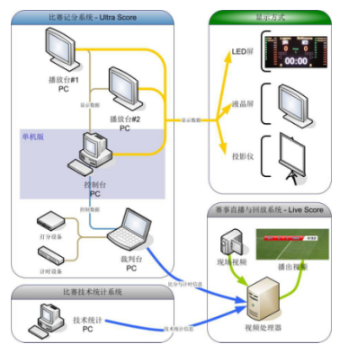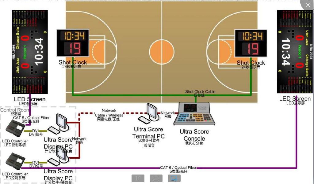 體育館兩邊安裝兩塊LED顯示屏,兩塊屏后的控制室內(nèi)分別設(shè)立控制電腦,負(fù)責(zé)大屏的控制和顯示,大屏通過LED數(shù)據(jù)和控制電腦相連。場館內(nèi)設(shè)立局域網(wǎng),兩臺LED顯示屏控制電腦都連入網(wǎng)絡(luò),同時比賽期間放于場邊的裁判操作電腦連入局域網(wǎng),該電腦與籃球打分控制器相連接,比賽時裁判只需要在場邊進(jìn)行打分。兩塊大屏可同時顯示相同信息,也可以各自分別顯示不同的內(nèi)容。兩邊的籃球架上都安裝籃球24秒專用顯示屏,并用數(shù)據(jù)線連接到場邊的24秒控制臺上,比賽中可由專人負(fù)責(zé)進(jìn)行比賽和24秒計時操作。24秒控制臺與場邊的裁判控制電腦可以使用數(shù)據(jù)線連接,則也可以使用軟件來控制24秒計時的顯示同時在場邊配置了一套籃球?qū)S玫姆敢?guī)顯示器(單面顯示),用于顯示賽隊犯規(guī)次數(shù)。 一套籃球?qū)S们驒?quán)控制器(單面顯示),指示當(dāng)前控球權(quán)的一方。在單獨的一臺電腦上安裝籃球比賽用軟件,用于統(tǒng)計賽程中球員的賽場表現(xiàn)情況。比分直播系統(tǒng)通過與體育場館比賽計分系統(tǒng)、籃球技術(shù)統(tǒng)計軟件進(jìn)行通訊,在采集多路現(xiàn)場視頻信號的同時,對信號進(jìn)行本地化的快速編輯處理,實現(xiàn)現(xiàn)場實時比分疊加、球員信息顯等視頻播放要求。賽場的多媒體綜合信息發(fā)布系統(tǒng),與賽場計時記分系統(tǒng)聯(lián)動,用于在賽場周邊的屏幕上統(tǒng)一管理和發(fā)布球場相關(guān)的球賽得分信息、球員及裁判信息、廣告以及相關(guān)資訊、指引等。